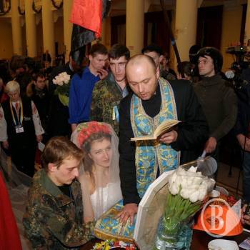 Первая революционная пара обвенчалась 5 февраля в помещении Киеврады, которая находится в распоряжении активисты Майдана.