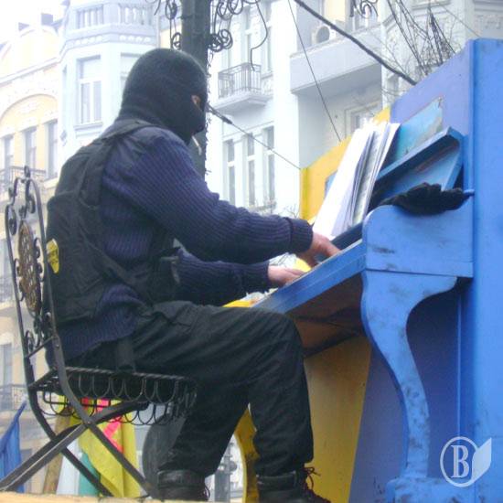 Над баррикадами раздаются «Революционный этюд» Шопена, другие произведения европейских композиторов. Дальше за пианино садились все, кто мог показать свою игру. Одно из выступлений было необычным. Музыканта представили как «пианиста-экстремиста». Именно «экстремистами» называют участников революции ее враги. А этот молодой парень, который так и не снимал во время игры маску, замечательно играл классическую музыку (на фото).