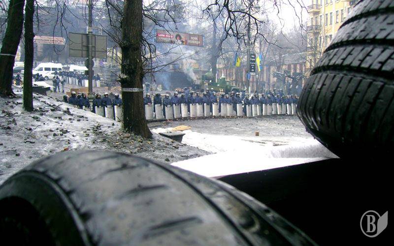 Киев, правительственный квартал, улица Грушевского. По-видимому, в настоящее время главная баррикада страны.