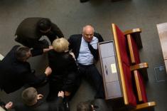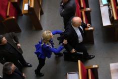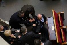 "Схватки начались и в зале - депутаты от оппозиции побили пару коммунистов, которые пытались вслед за ПР бежать из зала", - написал Бригинец. Ранее внефракционный депутат Анатолий Гриценко заявил, что регионалы и коммунисты думают, как бежать домой из Рады.