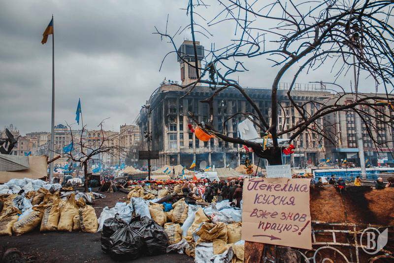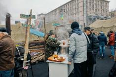 А на Майдане в то время, в полевой кухне, женщины активно предлагали еду всем прохожим. Борщи, супы, бутерброды, сало и горячие напитки, - все это они предлагали каждому.