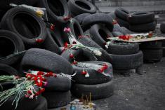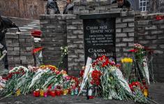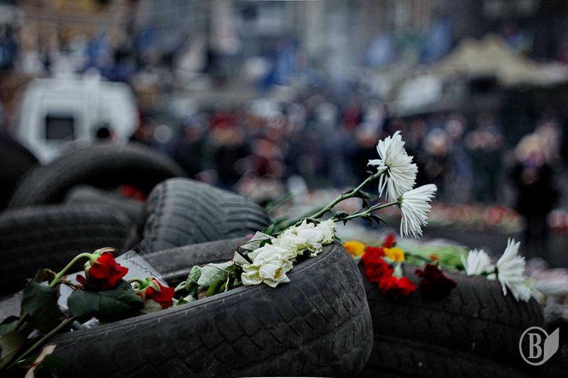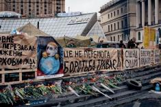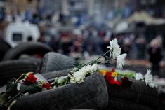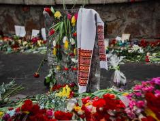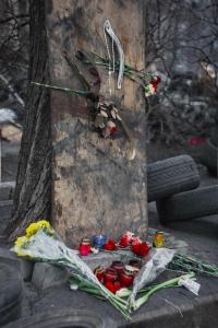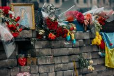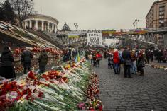 На сцене Майдана раздается молитва, всюду цветы и свечи, такое ощущение, что происходят большие похороны.
