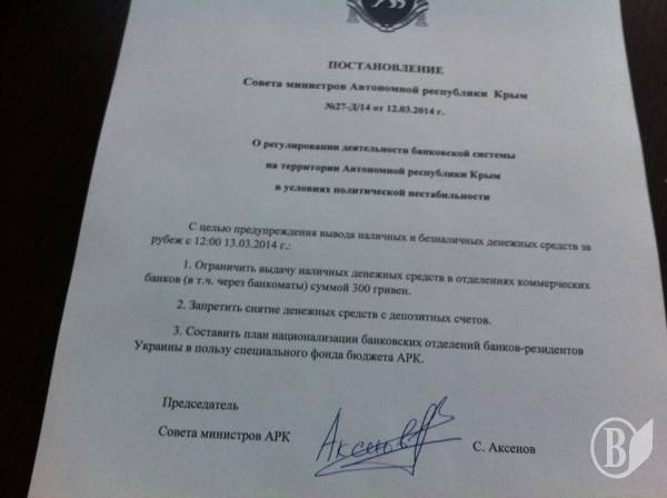 Сампровозглашенный Совет министров АРК ограничивает доступ населения к наличным средствам и депозитам.