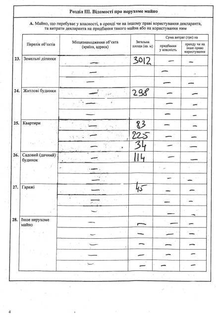 Как и в прошлом году, Арсений Яценюк является собственником земельного участка площадью 3012 квадратных метров, жилого дома площадью 298 квадратных метров, трех квартир общей площадью 342 квадратных метра (две в Киеве и доля в квартире в Черновцах), садового дома площадью 114 квадратных метров и гаража площадью 45 квадратных метров.