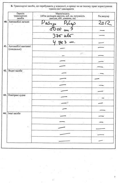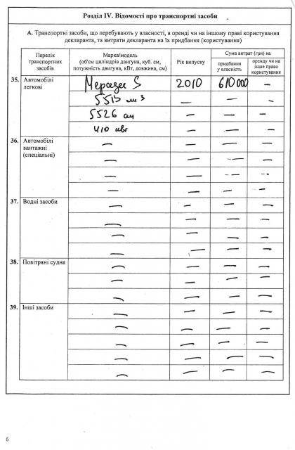 В декларации Арсений Яценюк указал доход от продажи автомобиля - джипа Range Rover (доход от отчуждения движимого имущества - 980 000 грн), а также приобретение в собственность автомобиля Mercedes S2010 года выпуска за 610 000 грн.