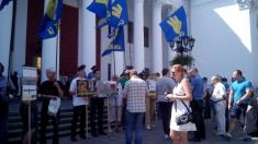 Обласна організація ВО «Свобода» пікетувала ХХХ сесію міської ради проти винесеного на порядок денний питання "про увічнення кремлівських терористів та провокаторів, які згоріли в Будинку профспілок 2 травня 2014 року".
