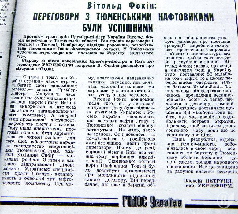 І тоді Вітольд Фокін 3 березня 1992р. полетів до нафтовиків Тюмені, багато з яких були з України і працювали там вахтовим методом. Він домовився з керівництвом області про обмін нафтосировини і пального на продукти харчового виробництва і товари народного споживання. Було підписано «Договір між урядом України і адміністрацією Тюменської області».