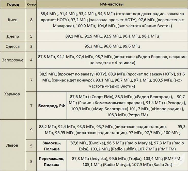 По данным ресурса, в Киеве есть 8 свободных FM-частот, в Днепре – 5, в Одессе – 3, а в Запорожье – 4. С приграничной харьковской областью куда интереснее: в областном центре доступно 7 радиостанций из Белгорода, находящегося в 80 км от Харькова, и столько же свободных частот – в самом Харькове. Во Львове сайт насчитал 9 свободных частот; в городе также доступен сигнал польских радиостанций – по 5 из практически приграничного Перемышля и города Замосць, находящегося в 130 км от Львова.