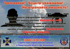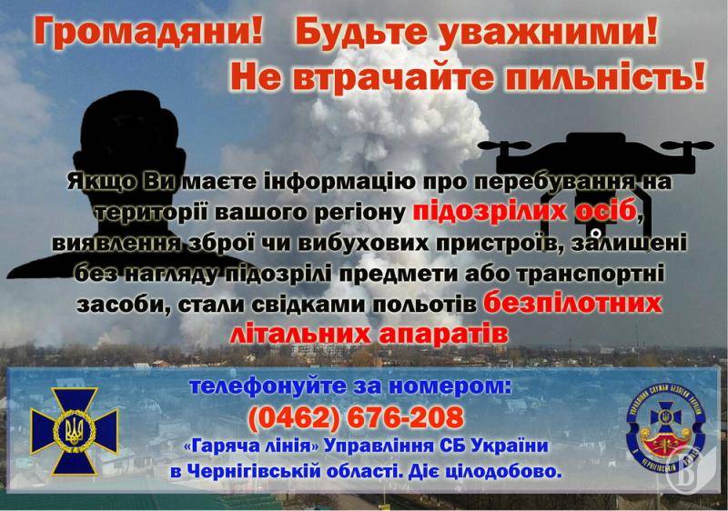 У разі наявності даних про факти прибуття та перебування в регіоні підозрілих осіб, або польотів безпілотних літальних апаратів, виявлення зброї чи вибухових пристроїв, залишені без нагляду підозрілі предмети або транспортні засоби просимо повідомляти про це до Управління СБ України в Чернігівській області (м. Чернігів, вул. Шевченка,28), або за номером «гарячої лінії» (0462) 676-208 (працює цілодобово) та на електронну поштову скриньку: usbu_chg@ssu.gov.ua