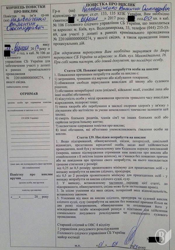 «Це – реакція на мою підтримку Михайла Саакашвілі та активістів у боротьбі за свої права», – сказав лідер Руху «Справедливість» Валентин Наливайченко, демонструючи повістку під час прес-конференції в ІА «УНІАН».