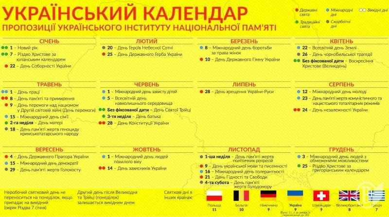 Нагадаємо, раніше Український інститут національної пам’яті пропонував Урядові впорядкувати календар державних свят і пам'ятних днів та підготував документ – проект закону щодо впорядкування календаря свят.