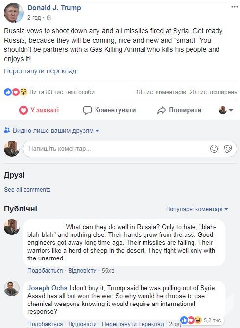 В ньому міститься напівжартівлива відповідь на погрози з боку РФ, що вони збиватимуть всі ракети в Сирії. Трамп каже, що ракети таки прилетять і що нічого заводити партнерство з тваринами, які труять людей газом і отримують від того насолоду (це про Башара Асада).