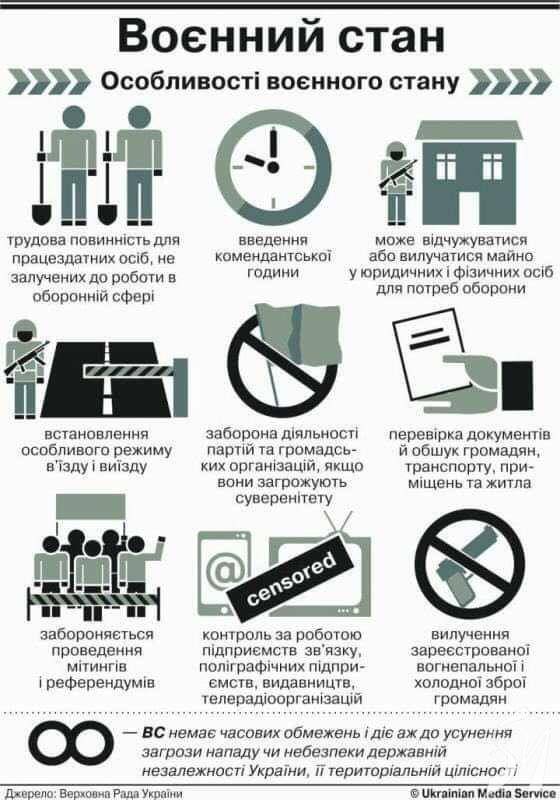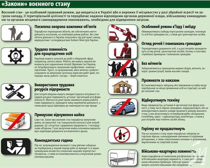 Тож нині чимало джерел пропонують практично «на пальцях», чи то пак на піктограмах пояснити, що воєнний стан передбачає.