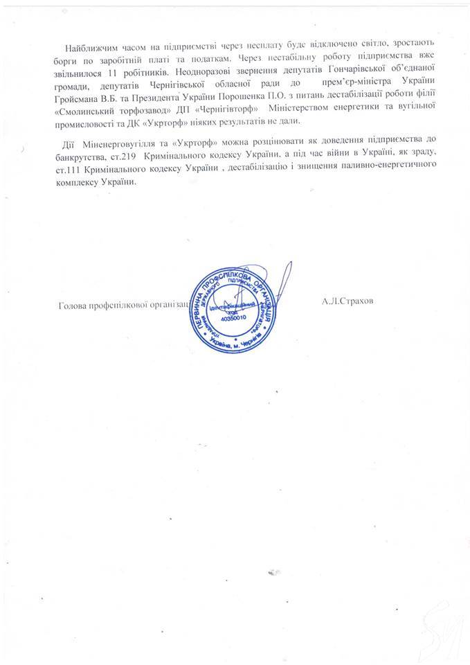 На переконання голови первинної профспілкової організації ДП «Чернігівторф» Андрія Страхова, дії Міненерговугілля та концерну «Укрторф» треба розцінювати як доведення підприємства до банкрутства (стаття 219 Кримінального кодексу України), а під час війни – як державну зраду (стаття 111 ККУ), дестабілізацію і знищення паливно-енергетичного комплексу України.