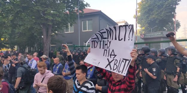 У Києві під офісом телеканалу NewsOne, який планував провести телеміст з російським телеканалом "Росія", відбувається акція протесту.