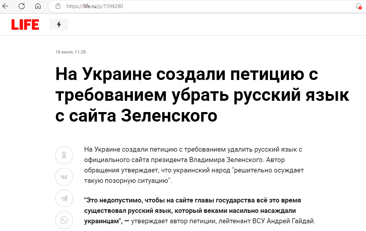 На сайті електронних петицій президента України з’явилося звернення з вимогою прибрати російськомовний розділ із офіційного вебпорталу голови держави. Петицію 17 липня зареєстрував лейтенант ЗСУ Андрій Гайдай. Менш як за добу його підписало 2 тисячі громадян із необхідних 25 тисяч.