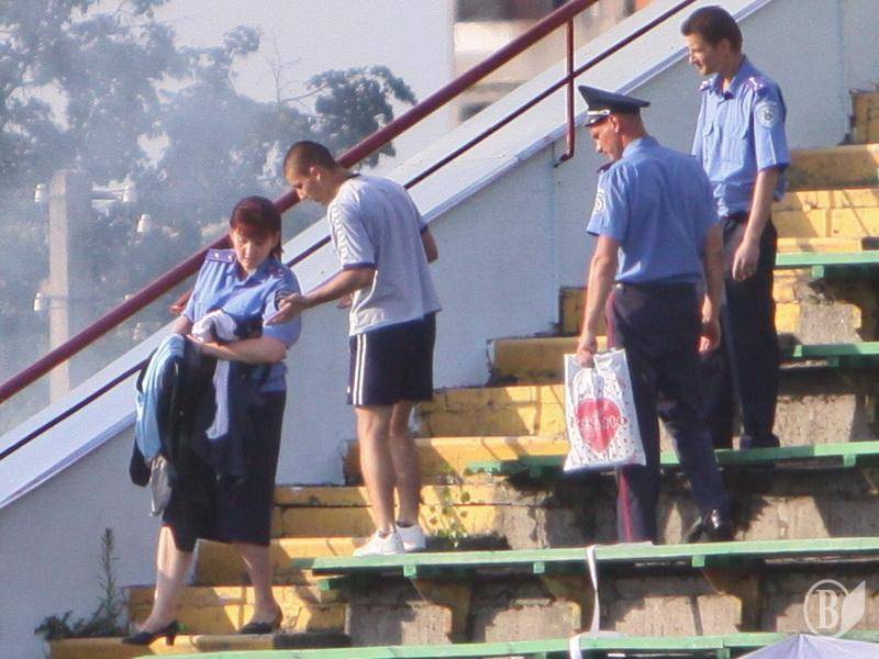 Что интересно, заводилой выступила тетя в милицейской форме, которая по ступенькам поднялась к болельщикам, …забрала их одежду и ушла. Естественно, все ребята бросились за ней, требуя вернуть предметы гардероба.