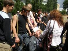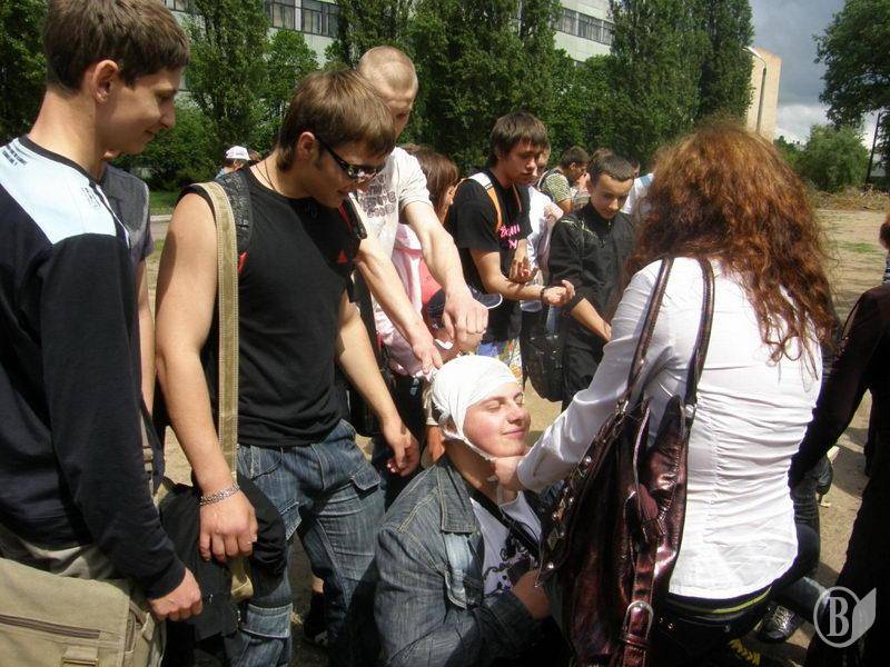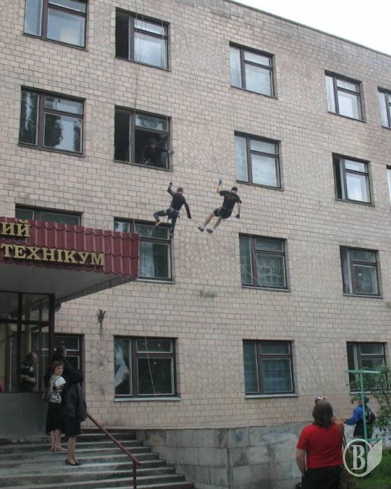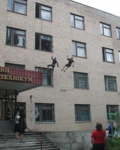 Некоторые «пострадавшие» были эвакуированы спасательной службой SOS, а именно: через окно третьего этажа «спасены» три студента и преподаватель путем опускания их по канатам, а «пострадавший» один из заведующих отделения вынесен на носилках. Приятно было наблюдать за ловкими действиями студента группы ЕУ-0704 Антоня Сергея, члена спасательной службы.