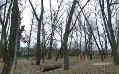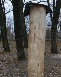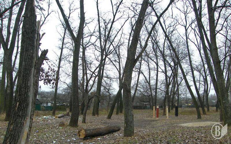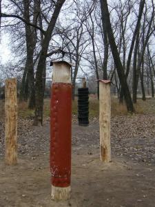 Стоїть турничок. Лежить пісочок. Стоїть набраний з покришок стовпчик, мабуть, щоб бити ногами. Вкопані три колоди висотою з людський зріст. Дбайливо прикриті шматками лінолеуму, мабуть, щоб на «голову» не капало.