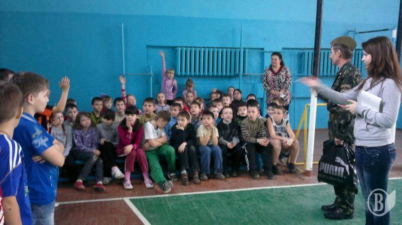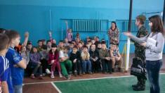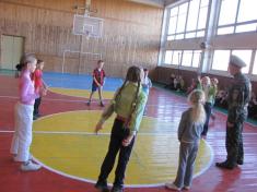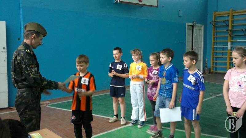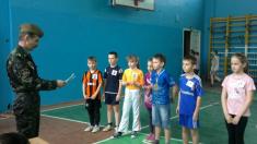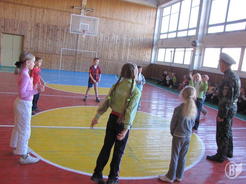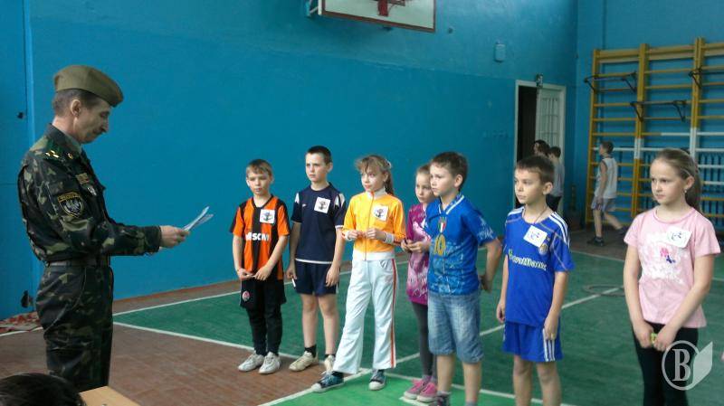 Усі учасники команд стоять струнко, а вчитель фізкультури проводить розминку з юними козаками, щоб вони трохи розігрілись. На суддівських місцях сидять: головний суддя – педагог-організатор Нитченко Тетяна Михайлівна і секретар – голова ради старшокласників «Лідер» Розумна Анастасія.