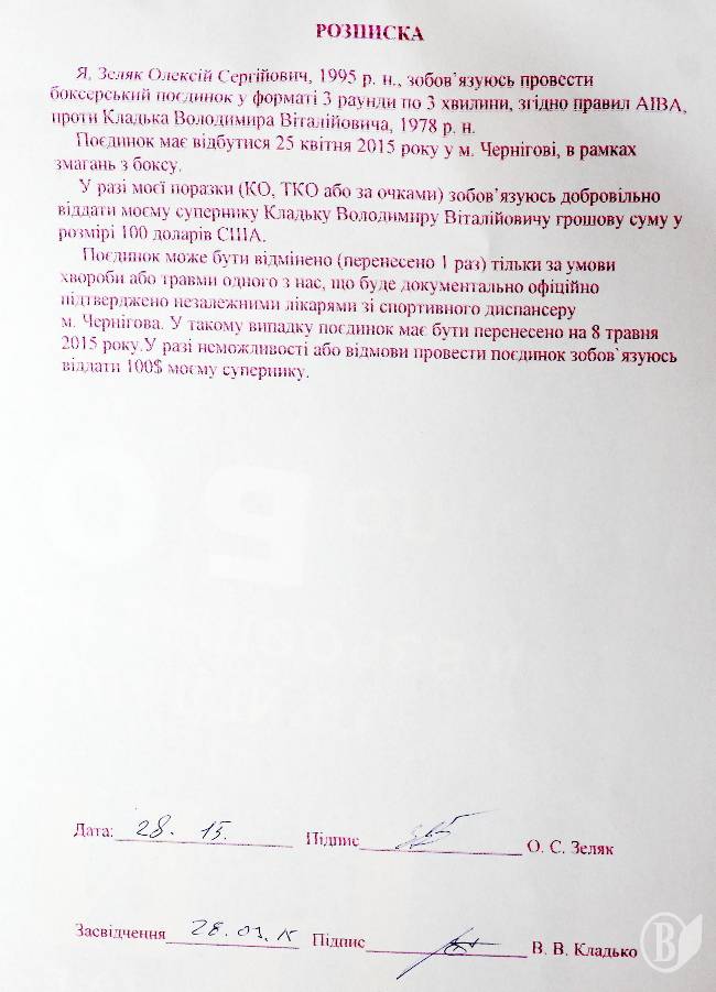 Высокий Вал уже рассказывал о предыстории этого конфликта. В январе месяце на соревнованиях в Новгород-Северском Алексей Зеляк при свидетелях заявил, что победит Владимира Кладько в боксерском поединке. Побежденный боксер должен отдать 100$ своему сопернику.