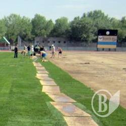 Поки команда ФК «Десна» грає «домашні» матчі на стадіоні «Оболонь-арена» в Києві, на стадіоні імені Гагаріна в Чернігові триває таки укрладка газону на основному полі.