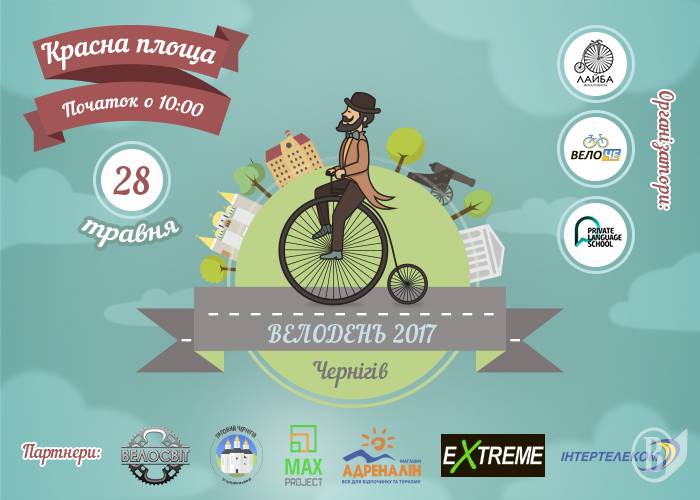 28 травня в місті Чернігові відбудеться Велодень 2017 під гаслом «200 років велосипеду».