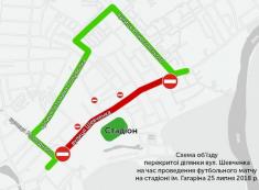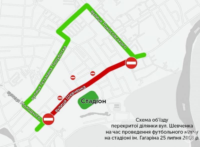 Тим часом Управління транспорту, транспортної інфраструктури та зв'язку звертає увагу, що для забезпечення безпеки і правопорядку під час футбольного матчу 25 липня з 17:00 до 22:00 буде обмежений рух автотранспорту на ділянці дороги на вул. Шевченка від вул. О.Молодчого до вул. Рокоссовського, окрім громадського транспорту.