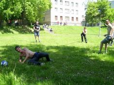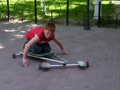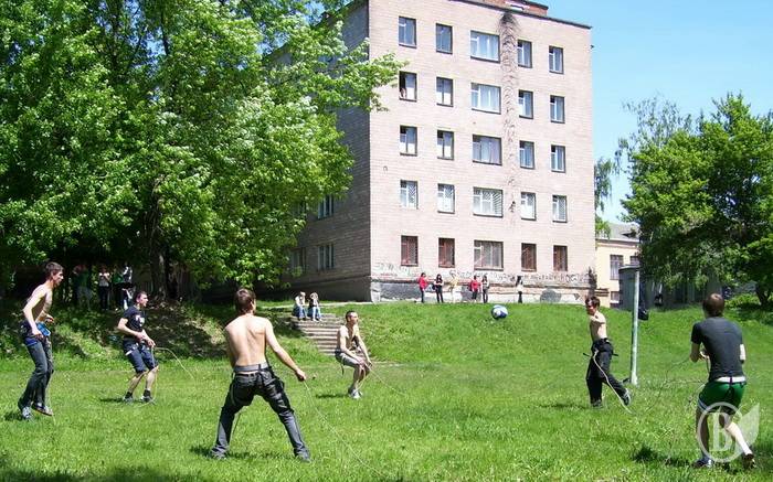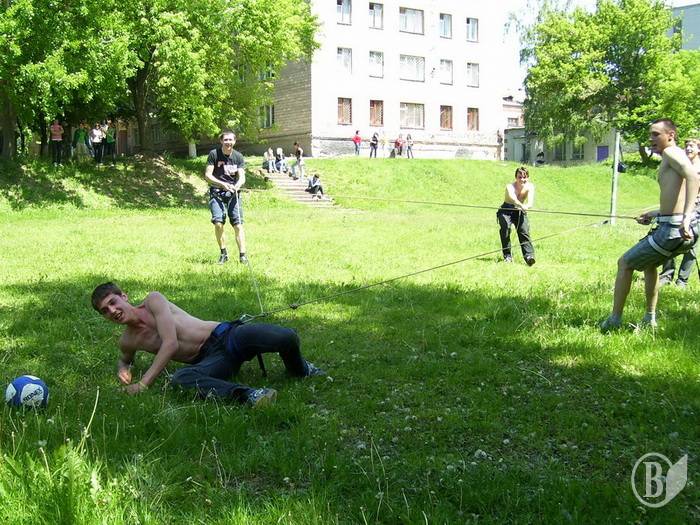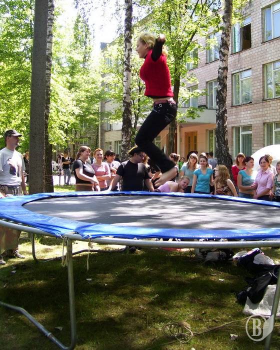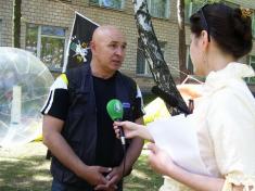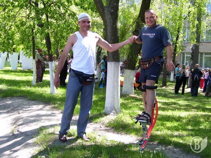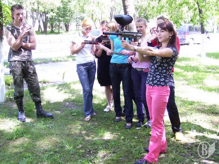 На галявині біля входу до Профтехучилища розташувалися представники різного виду екстремального відпочинку зі своїм спорядженням. Хто з чим: з батутом, з «джоліджампером», з катамараном, з водною кулею, з пейнтболом...