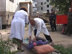 Під час проведення першого етапу практично відпрацьовані дії підрозділів Бахмацького гарнізону МНС та спеціалізованих служб цивільного захисту з ліквідації наслідків вибуху побутового газу в багатоповерховому будинку.