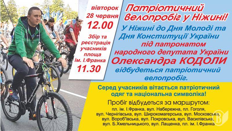 У Ніжині до Дня Молоді та Дня Конституції України 28 червня відбудеться другий традиційний патріотичний велопробіг.