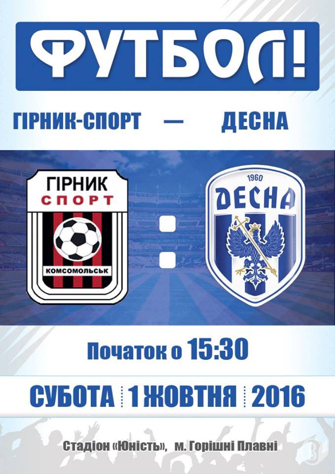 Следующий матч команда футбольного клуба «Десна» проведет 1 октября против местного «Горняка-Спорт» в Горишних Плавнях (это декоммунизованный Комсомольск на Полтавщине).