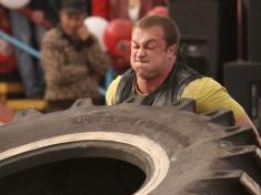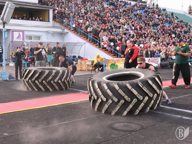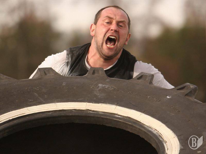В упражнении"Переворачивание колеса"спортсмены переворачивали покрышку весом 360 кг. Соревновались по количеству раз на время.