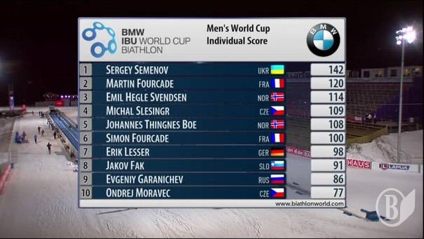 Эта цель была поставлена и Сергей сосредоточился на ее выполнении. Ошибшись однажды на первом огневом рубеже, черниговский биатлонист закрыл все другие мишени. Лишь один промах не позволил Семенову быть в тройке призеров. Сергей финишировал пятым и сохранил за собой лидерство в общем зачете этой дисциплины. Наш спортсмен опередил на 22 очка ближайшего преследователя — Мартена Фуркада.