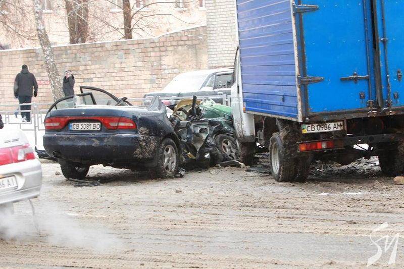 Сьогодні, 2 грудня в Чернігові на заокругленні вул. Івана Мазепи сталося зіткнення трьох авто: легковиків Mitsubishi та Dacia і «ГАЗелі» з будкою.
