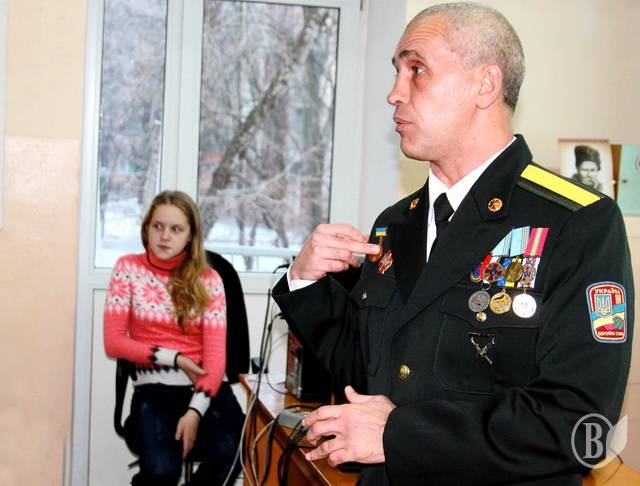 Розповів про кожну нагороду, яка прикрашає його груди. Ознайомив присутніх із роллю волонтерського руху на сьогоднішній день. Усім зрозуміло, що без допомоги волонтерів українським військовим в зоні конфлікту було б нелегко. Валерій Михайлович розказав учням про особисті речі, які дуже необхідні військовослужбовцю в зоні АТО. Звернув увагу на те, що в зоні бойових дій обов’язково потрібно дотримуватися правил поведінки.
