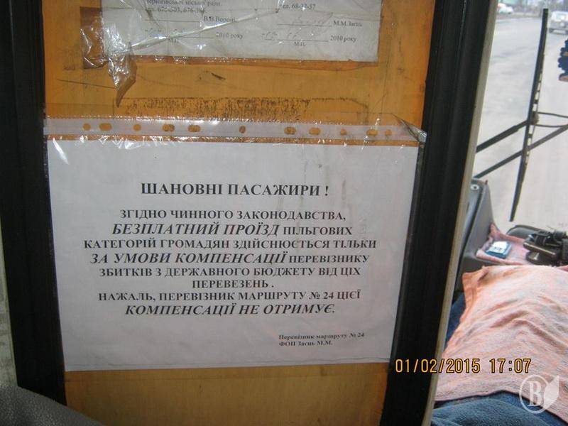 З 1-го лютого з’явилося та було зафіксовано в автобусах №1, 24 та 37 оголошення, яке обмежує права людей пільгових категорій в користуванні громадським транспортом та порушує чинне законодавство.
