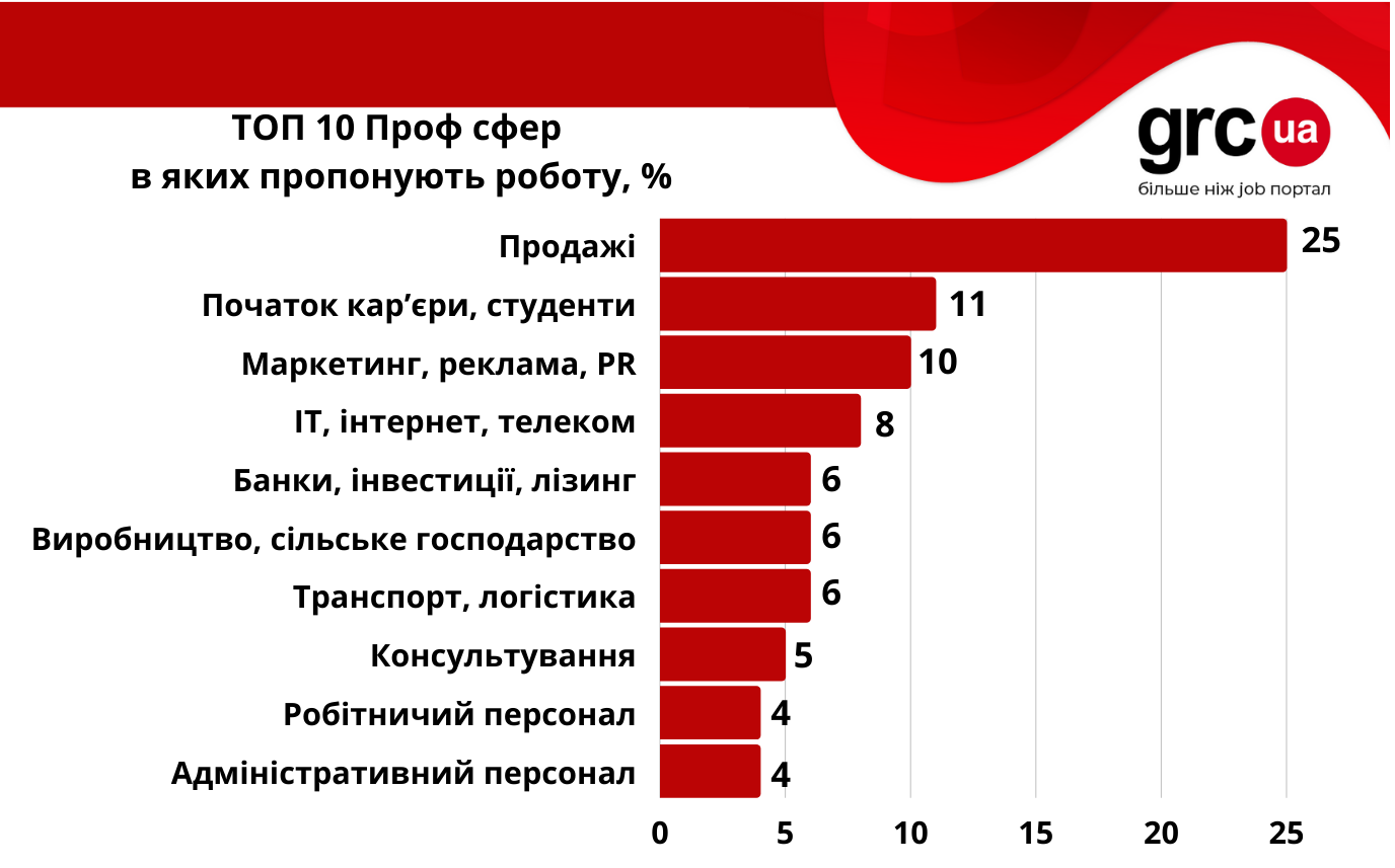 Найбільша кількість вакансій відкрита для спеціалістів з продажів (25%). Ще 11% роботодавців шукають молодих спеціалістів або студентів на підробіток або стажування. Третя за затребуваністю професійна сфера Чернігівщини - «Маркетинг, реклама та PR» (10%)