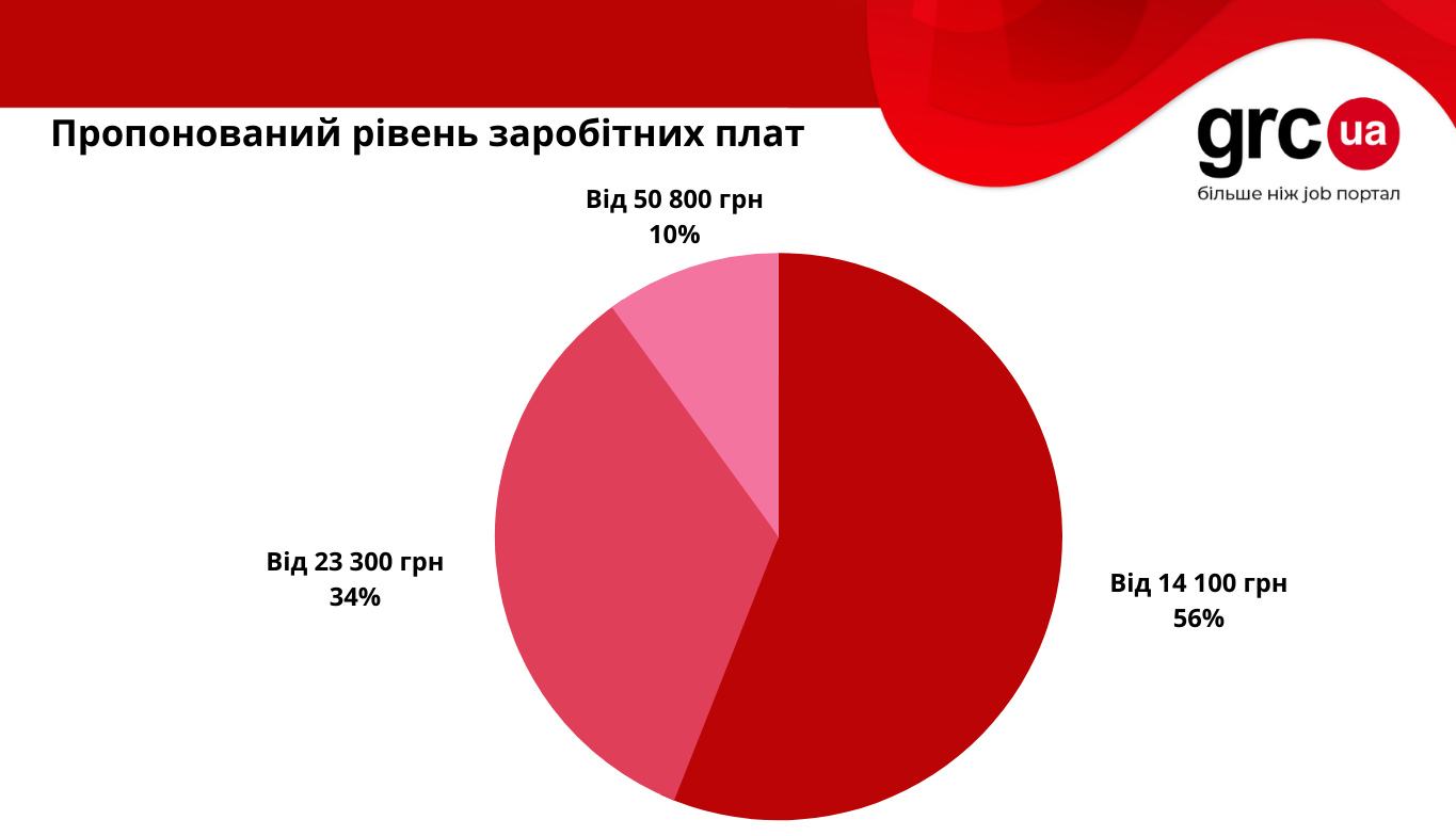 Переважна більшість роботодавців регіону (56%) пропонують кандидатам заробітну платню від 14 тис. грн. Ще 34% готові платити від 23 тис. грн. Найчастіше таку компенсацію пропонують менеджерам середньої ланки, спеціалістам з продажів та експертам у сфері будівництва та нерухомості. Наприклад, спеціалістам з продажів кормів та дезінфікуючих засобів для тваринницьких господарств пропонують компенсацію від 30 тис. грн, бонус від продажів, компенсацію мобільного зв’язку, службове авто для роботи, офіційне працевлаштування та корпоративне навчання. Але, ця вакансія доступна лише кандидатам із досвідом роботи не менше трьох років у сфері тваринництва/птахівництва та готовим до постійних службових відряджень по Україні.