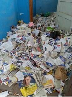Плакати, програми, газети - все, що душа забажає. Дуже багато продукції лежить недоторканими пачками. Наприклад, газета «Чернігівщіна», прямо стопки, так, ніби їх хтось прямо з поштового відділення вилучив і сюди привіз.