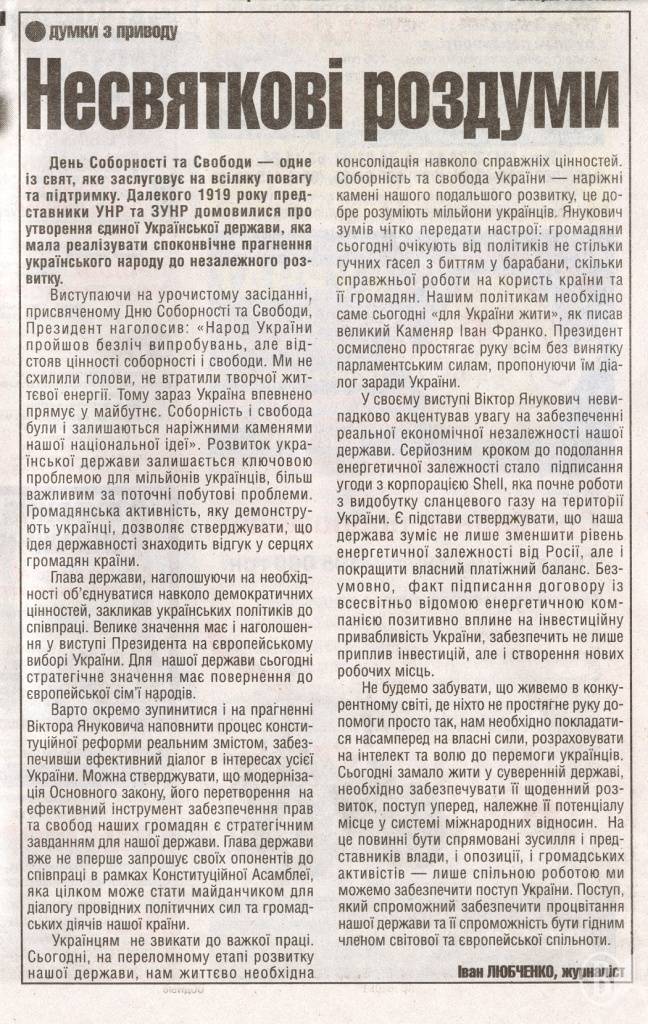 У наступному номері цієї газети № 4 від 24 січня 2013 року під заголовком «Свято єднання Українців» було розміщено розлогій звіт про урочисті зібрання і концерт в обласній філармонійному центрі фестивалів та концертних програм до Дні Соборності та Свободи України. У цій газеті також було розміщено фотографії в.о. голови обласної державної адміністрації, заступника голови-керівника апарату облдержадміністрації Миколи Стрільця та учасників концерту. А де заходи громадськості, зокрема й опозиції в області?