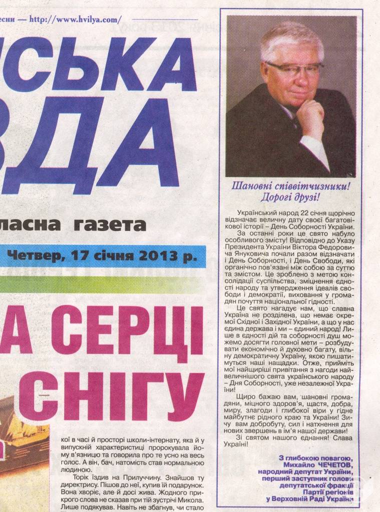Так головна офіційна обласна газета «Деснянська правда», співзасновниками якої є Чернігівська обласна рада та облдержадміністрація (видається за кошти платників податків, які представляють весь спектр політичних уподобань в області), напередодні світа розмістила на першій сторінці газети № 3 від 17 січня 2013 року тільки вітання нардепа-регіонала Михайла Чечетова з Днем Соборності та Свободи України та його фотографію.