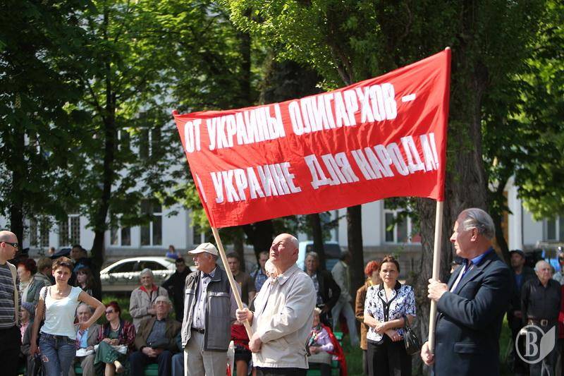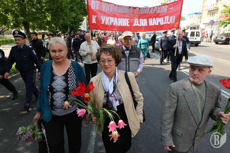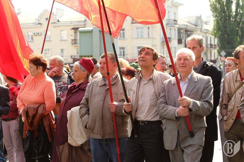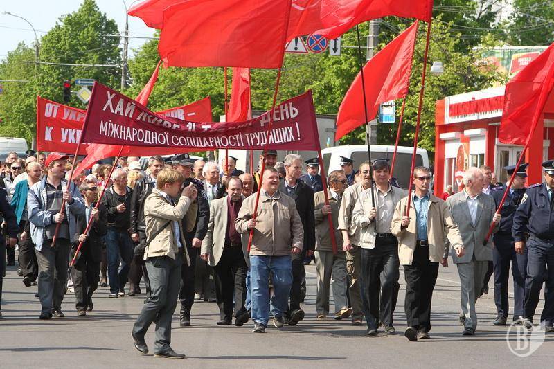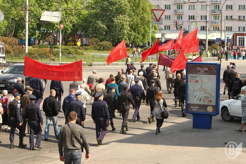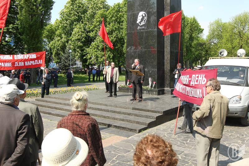 Учасники акції тримали червоні прапори КПУ і гасла " Хай живе 1 Мая- день Міжнародної солідарності трудящих» , «Від України олігархів - до України для народу" , "Геть владу капіталу - владу трудовому народу".