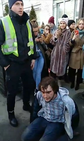 На вулиці патрульний поставив на коліна Леоніда, поки чекав прибуття підмоги щоб його запакувати в машину: