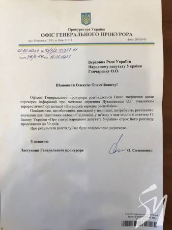 "Тому 16 червня я направив депутатське звернення Генеральному прокурору Ірині Венедиктовій щодо співпраці Олександра Лукашенка з терористами так званих "ЛНР". Моє звернення підтримали колеги-депутати, за що я їм дуже дякую! Дії Лукашенка — це посягання на нашу територіальну цілісність! Україна має відкрити кримінальну справу проти диктатора за співпрацю з терористами. Окрім того, потрібно посилювати тиск, сакнційний та економічний. Лукашенка можна і треба додавити всіма доступними засобами", – зауважив Олексій Гончаренко.