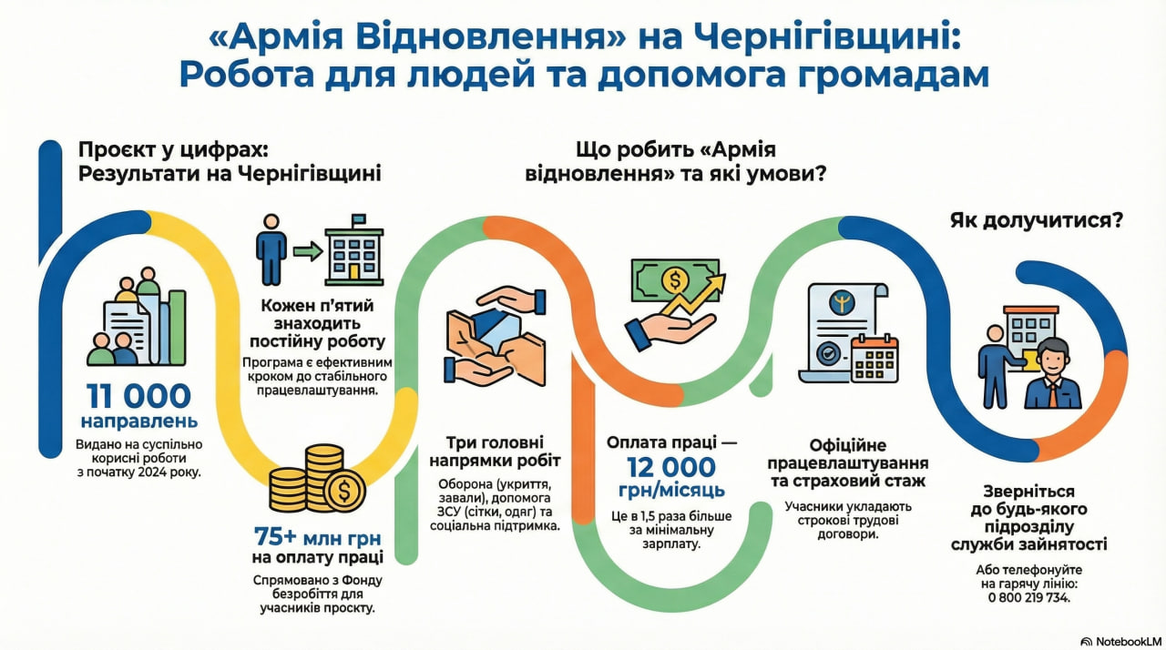 Від початку 2024 року в Чернігівській області видали 11 тисяч направлень на суспільно корисні роботи в межах урядового проєкту «Армія відновлення». Понад 2 тисячі осіб уже завершили або продовжують працювати на об’єктах області, а кожен п’ятий учасник програми згодом зміг знайти постійну роботу.