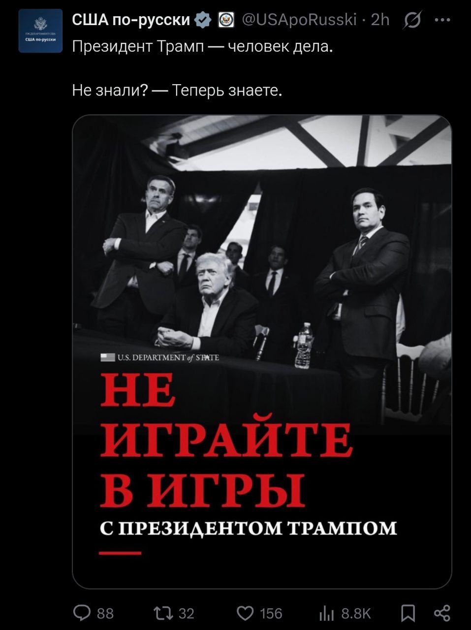 «Президент Трамп — людина діла.Не знали? — Тепер дізнаєтесь.Не грайте в ігри з президентом Трампом».