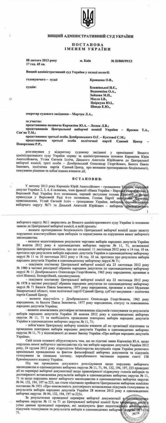 «У лютому 2013 року Кармазін Юрій Анатолійович – громадянин України…(та ще два громадянина)… звернулись до ВАСУ із позивною заявою до ЦВК, в якій просять: визнати…, скасувати…»