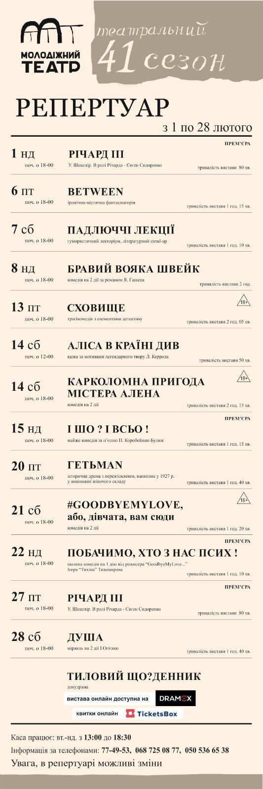 Якщо подивитися на афішу, в репертуарі крутяться одні й ті самі назви: «Побачимо, хто з нас псих», «Бітвін», «Сховище», «Гудбай, май лав», «Дівчата, вам сюди», «Гетьман».